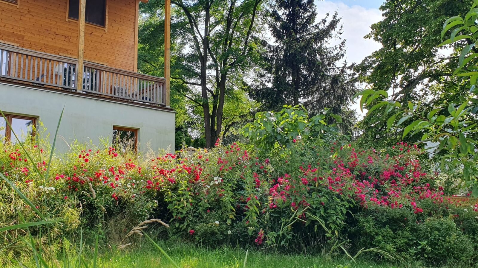 Auf 860 m2 Eigengrund genießen Sie die Kraft des riesigen Lindenbaums. Bewacht von einer Fichte und einem Akazienbaums zieren hunderte Bodendeckerrosen flankiert von Lavendel die Verbindung zwischen den zwei Gartenebenen. Bio-Obst von Himbeeren, Brombeeren, Stachelbeeren, Johannisbeeren über Feigen bis hin zu seltenen, alten Sorten an Apfel, Kirsche und Birne genießen Sie aus Ihrem eigenen Garten.